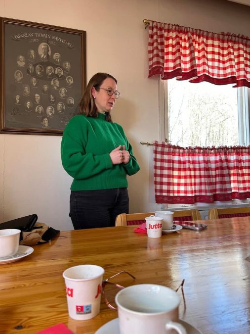 Työväentalolla nautittiin keskustelun lomassa kahvit ja kuultiin kuntavaaliehdokkaiden puheenvuorot päivänpolttavista aiheista puhujina Eveliina Heinäluoma, Olli-Pekka Koljonen ja Minna Salminen.