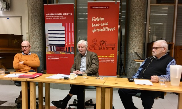 Työväenliikkeen kirjastossa Helsingin Sörnäisissä näistä teemoista keskustelivat tammikuun puolivälissä 2025 emeritusprofessori Seppo Hentilä, valtiotieteen tohtori, entinen kansanedustaja Erkki Tuomioja ja kaupunginvaltuutettu Thomas Wahlgren.