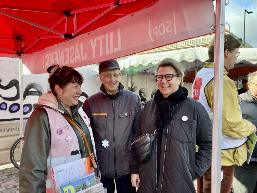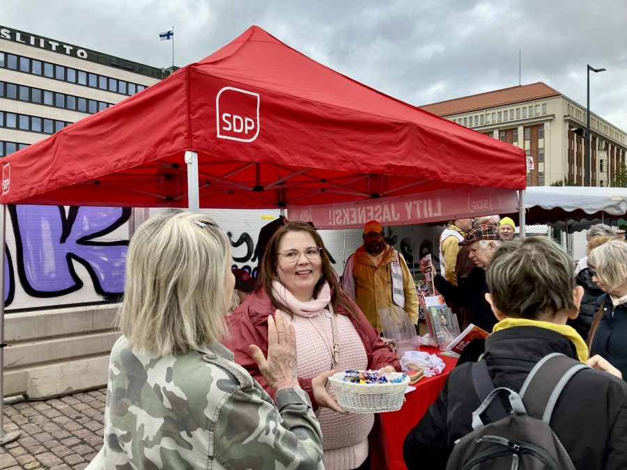 Piirin puheenjohtaja Anita Helman tuli Hakaniemeen Silakkamarkkinoilta, missä myös oli SDP-Helsingin teltta.