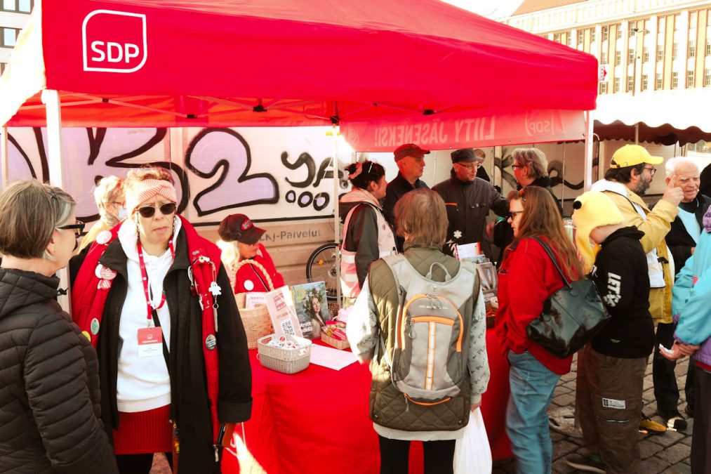 Hyvä sää ja mahdollisuus puhua politiikkaa veti tälläkin kertaa paljon väkeä Helsingin sosialidemokraattien teltalle Hakaniemen markkinoilla.